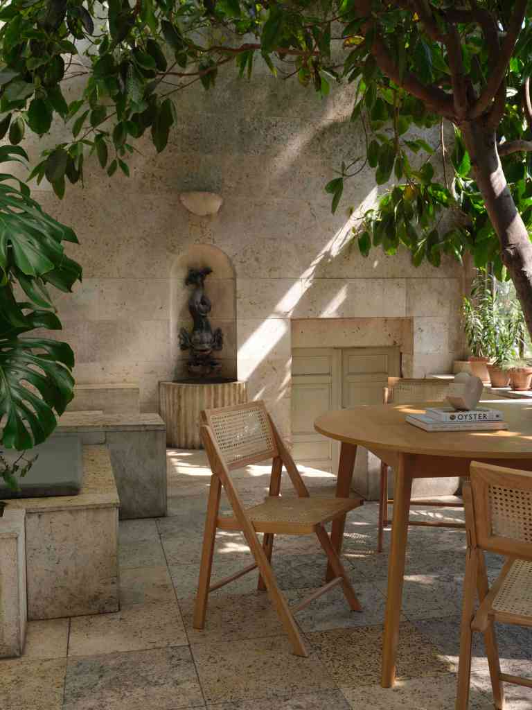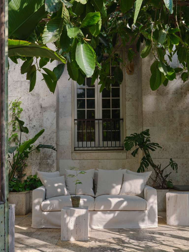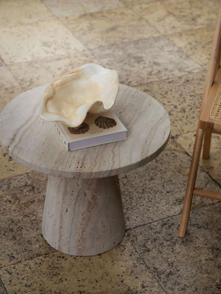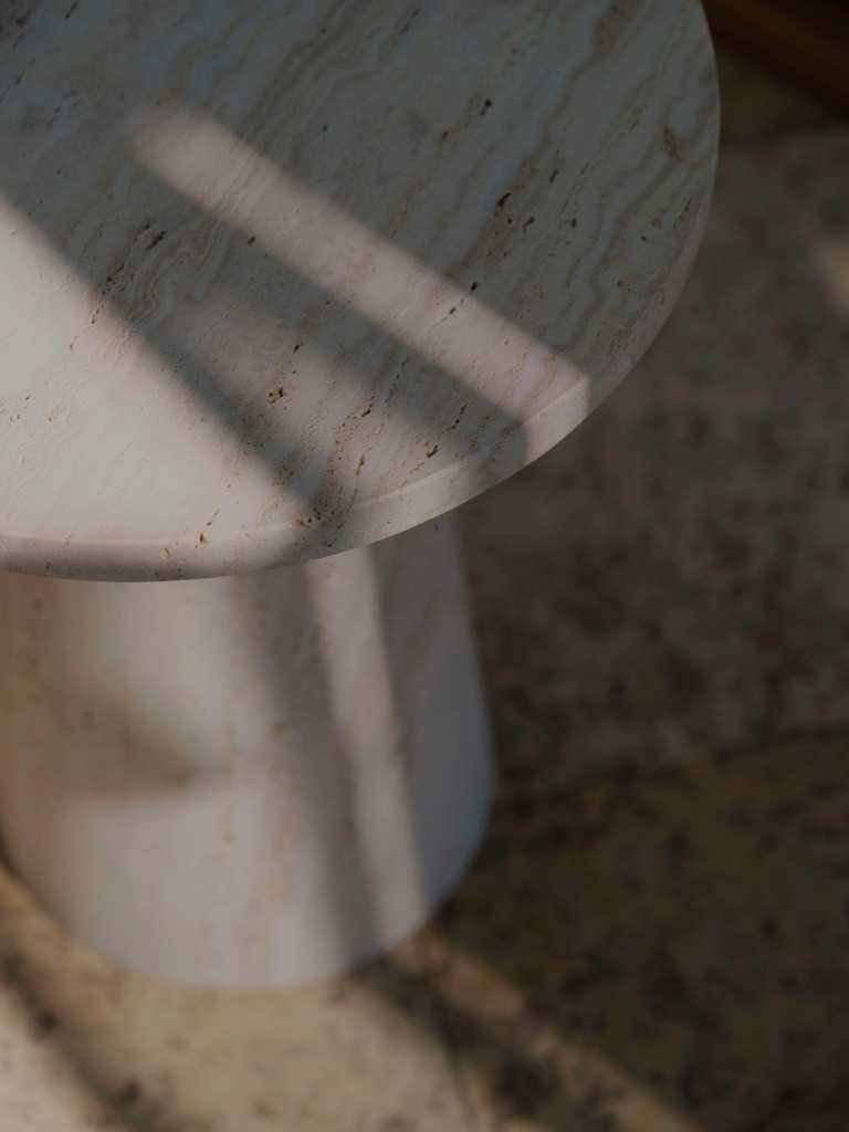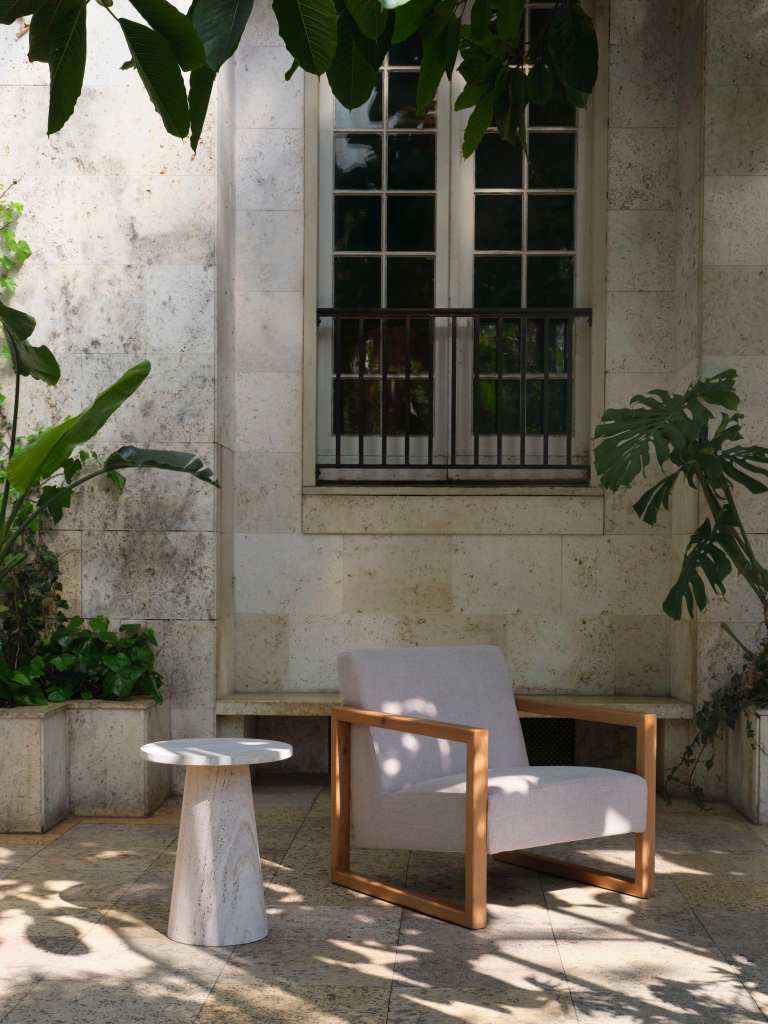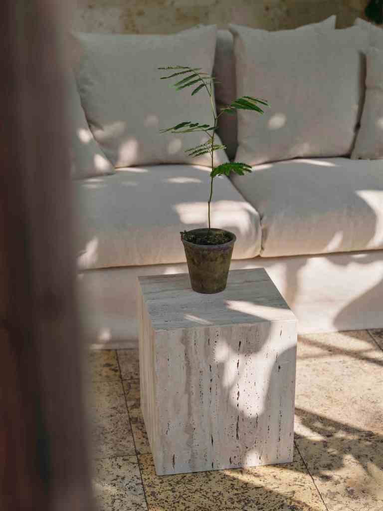 A new furniture line in linen, beige travertine, and warm wood, set in the gentle stillness of a 1900s orangerie in Østerbro.