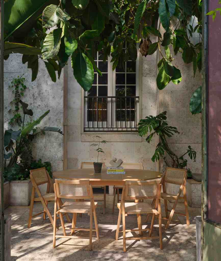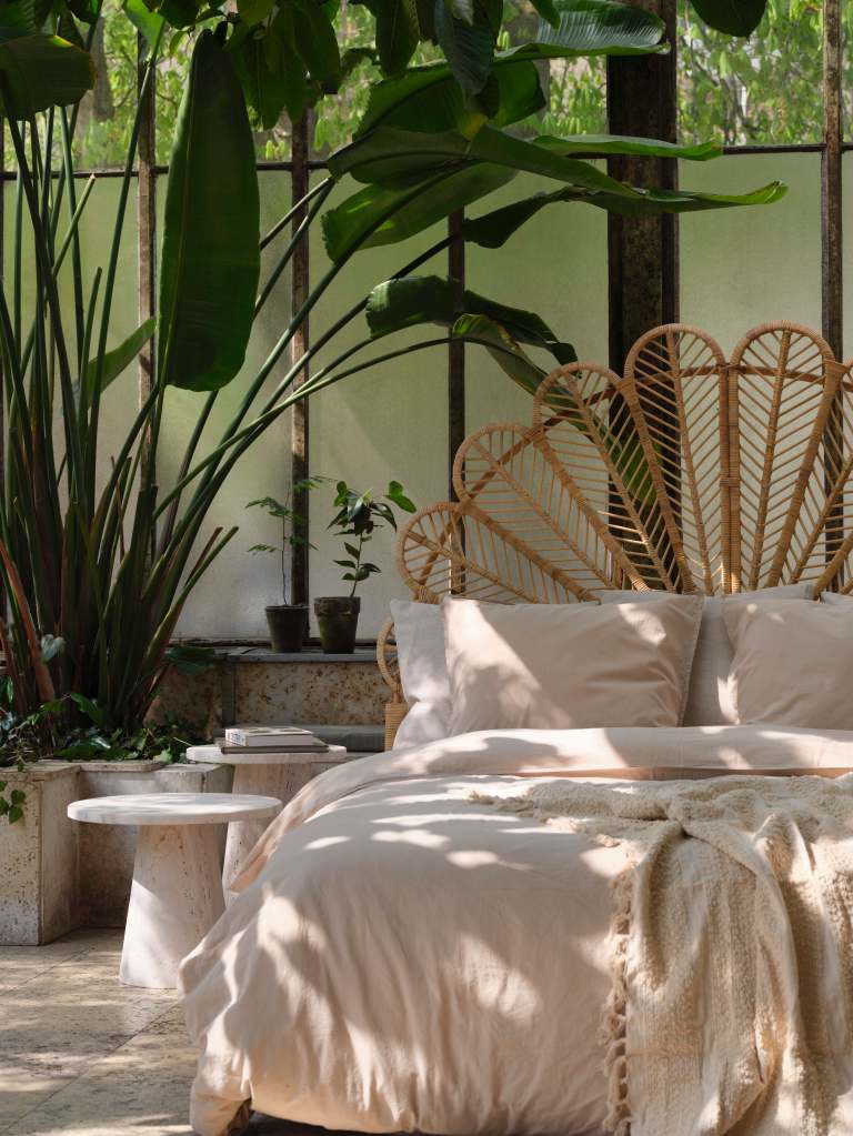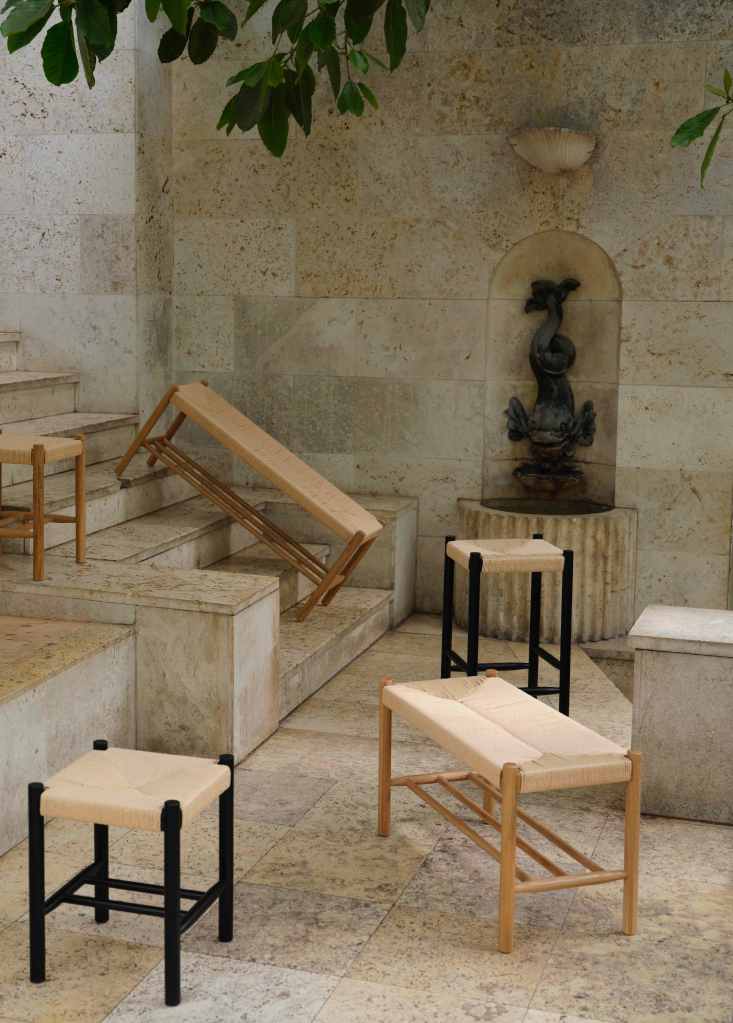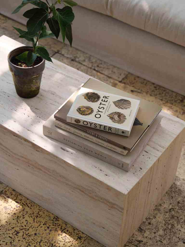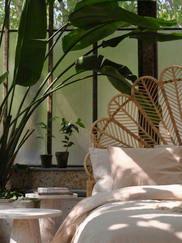 A new furniture line in linen, beige travertine, and warm wood, set in the gentle stillness of a 1900s orangerie in Østerbro.